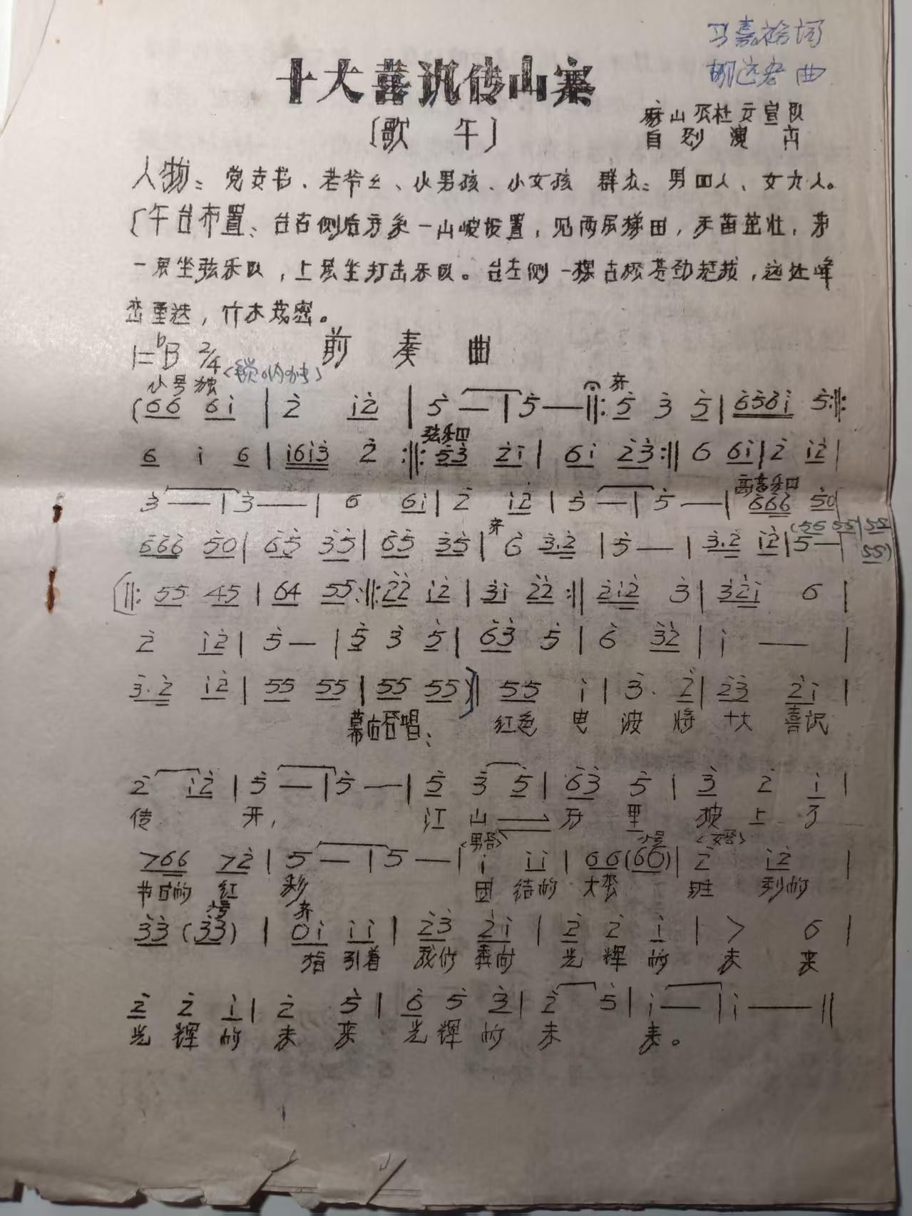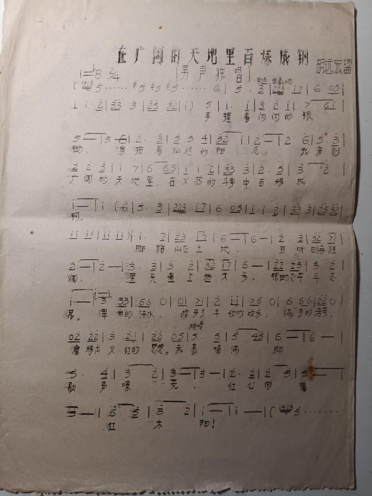 97.我30岁以前居然写过三首歌曲 • 远宏言论 • 近期翻翻故纸,忽然发现我30岁以前居然写过的三首歌曲,并且原始件依然尚在。 第一首是我19岁那年的作品,主要是作曲,实际上是写了多首曲子编成歌舞。1973年9月,萍乡市湘东区麻山公社文艺宣传队由习嘉裕作词、胡远宏作曲的歌舞《十大喜讯传山寨》在麻山公社公演,后来还参加了湘东区文艺会演且获得好评。我所作的曲子包括前奏曲、幕后合唱、男合、女合、男(内)独唱、领唱、合唱、独白时的配乐。整个歌舞约15分钟,音乐几乎覆盖全程。 (作品照片:这是第1页,共有8页) 第二首是我20岁那年的作品。1974年1月由我个人作词、作曲的男声独唱《在广阔的天地里百炼成钢》问世。歌词是: 手握着闪闪的银锄, 身披着灿烂的阳光, 我来到广阔的天地里, 在火热的斗争中百炼成钢。 脚踏山区土地, 耳听四海狂澜, 金光道上迈大步, 银锄飞舞斗志昂。 浑身的汗水, 换来了丰收的欢乐, 满手的老茧, 磨炼出火红的思想。 我豪情满胸歌声嘹亮, 红心向着红大阳! 手握着闪闪的银锄, 身披着灿烂的阳光, 我来到广阔的天地里, 在火热的斗争中百炼成钢。 ( 作品照片:这是第1页,共有2页) 当时我从麻山中学高中毕业回三山大队务农已近两年。两年来,我在第四生产队接受贫下中农再教育很自觉,很认真,重活、脏活、累活抢着干,还担任了该生产队团支部书记,在生产队办起了图书角或图书室,书吗,都是我一个人提供的。心里也有小九九,那就是表现好一点,争取劳动锻炼两年后能被推荐去上大学成为工农兵学员。此歌词和曲子符合我当时的心境。该首独唱歌曲由我作词、作曲、演唱,在麻山公社礼堂和湘东区文艺会演的舞台演唱都取得了不错的效果。湘东区文艺会演的组委会的领导们通过麻山公社的领队转达了他们对我自创自演独唱演出成功表示祝贺和赞赏。 第三首是我30岁那年的作品。1984年5月4日由我个人作词、作曲,萍乡教育学院中文教师进修班级全体学员演唱的《进修生之歌》在灯光球场举行的庆祝五四青年节大合唱比赛中大获成功。歌词是: 我们跨进大学的校门, 感情像春潮奔涌, 童年的理想, 重放时代的光彩, 历史的风雨, 洗涤了我们的心灵。 我们跨进大学的校门, 肩负着神圣的使命, 绚丽的朝晖, 唤醒了我们的智慧 ,灿烂的霞光, 闪耀着我们的青春。 啊, 今天是勤奋的学员, 明天是光荣的园丁。 (作品照片:共2页) 当年,我们这个进修班级共40名学员,大都是萍乡市内各中学的语文教师。1983年入学时年龄最大的近40岁,当年其儿子没有考上大学,母亲考上了;年龄最小的18岁,我29岁,属于中间年龄。 以上三首歌曲的创作和演出有如下特点:一是作者根本不懂作词作曲,没有经过任何专业学习或者培训,初生年犊不怕虎,聋子不怕大爆竹,跟着自己的感觉走,稀里糊涂就写出来了;二是创作出来的歌曲不仅在公社的舞台上,而且在县区或者高校的舞台上都公演过;三是演出后不管是人们出自鼓励还是确实认为不错反响似乎都还好;四是原始资料保存得比较好,不管作品的水平和价值如何,至少可以从某一个角度反映历史的原貌。