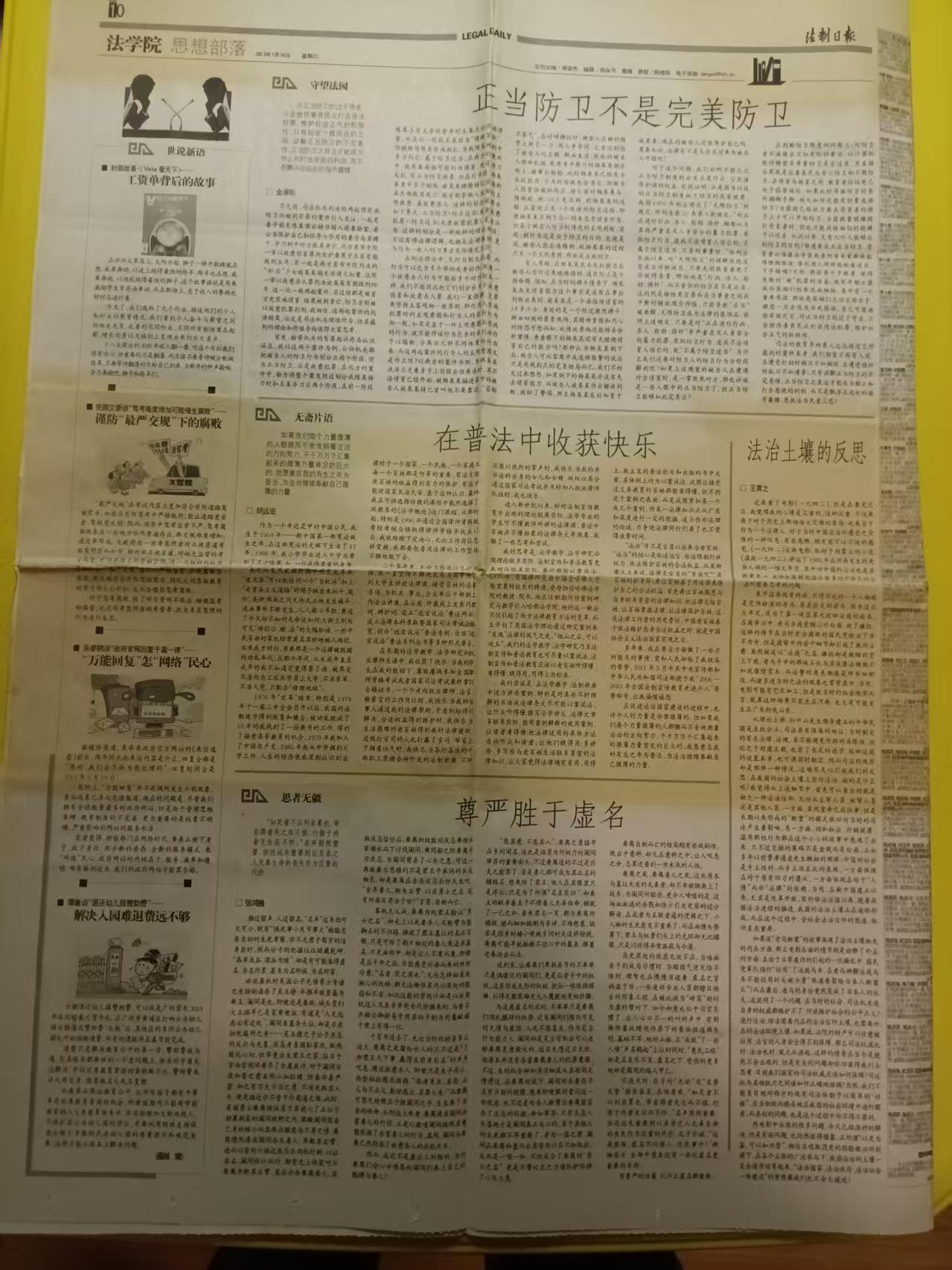 当日第10版“法学院思想部落”栏目发了3篇法学随笔。第1篇是金泽刚写的《正当防卫不是完美防卫》。金泽刚是武汉大学法学博士,同济大学法学院教授,博士生导师,同济大学刑事法研究中心主任,中国法学会会员,中国犯罪学研究会常务理事,上海市未成年人法研究会常务理事,上海市人民检察院特聘研究员,南方都市报、新京报专栏评论员。第2篇是我写的《在普法中收获快乐》。第3篇是张鸿巍写的《尊严胜于虚名》。张鸿巍是北京理工大学(珠海)长聘教授、博士生导师 ,暨南大学少年及家事法研究中心教授、人文学院院长,珠海特聘学者,美国Sam Houston State University刑事司法学博士、武汉大学法学学士。